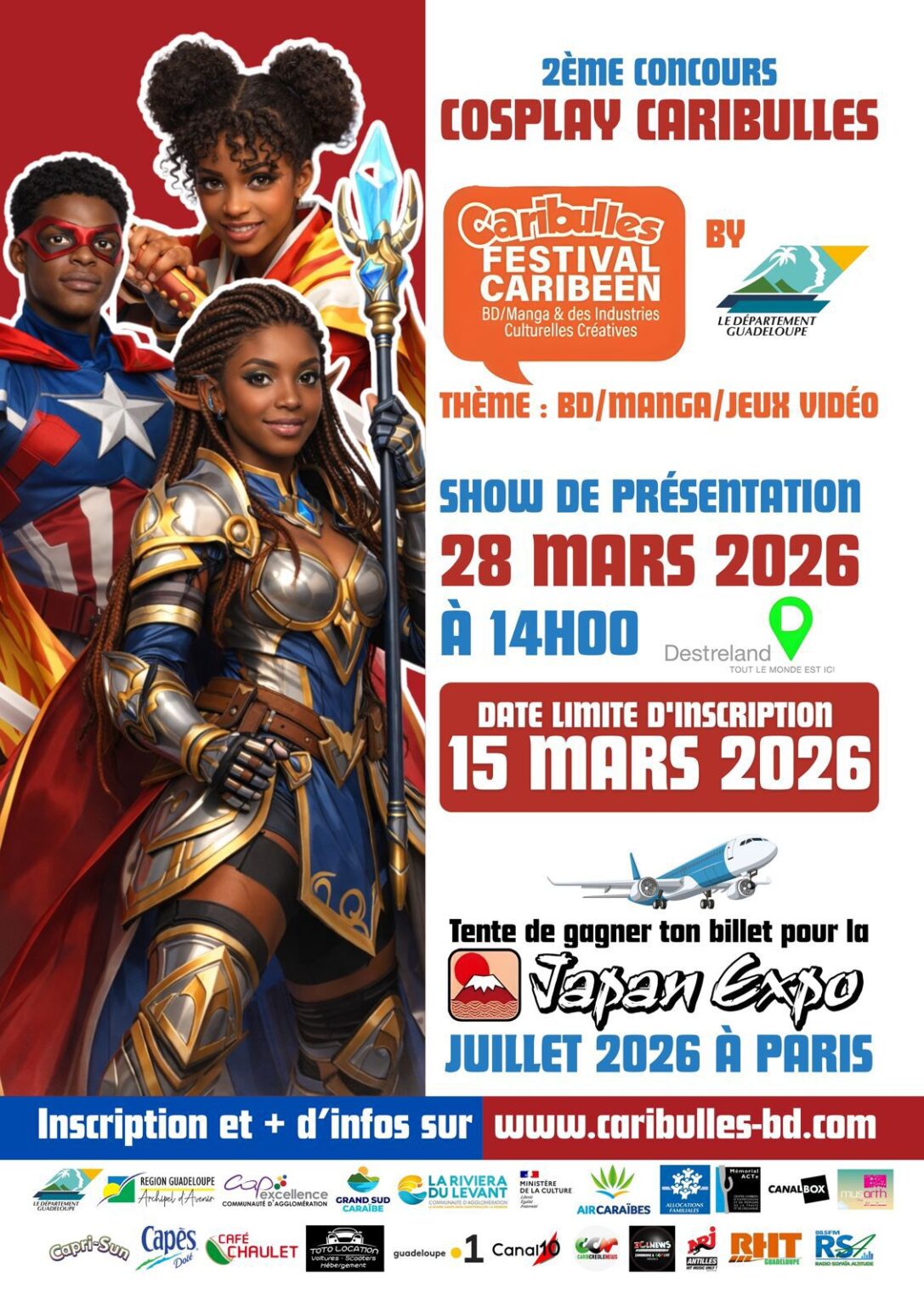Pré-sélection – Challenge Instagram • Sur Instagram, les candidat.es envoient en DM une photo de lui ou d’elle en tenue Cosplay • La photo sera publiée sur l’instagram de Caribulles • Les 20 cosplayers avec le plus d’interactions (Likes, commentaires, et partages) seront qualifiés pour participer à la finale.Finale – Prestation à Destreland